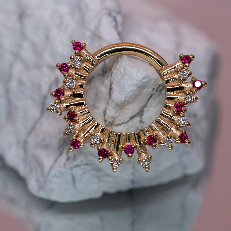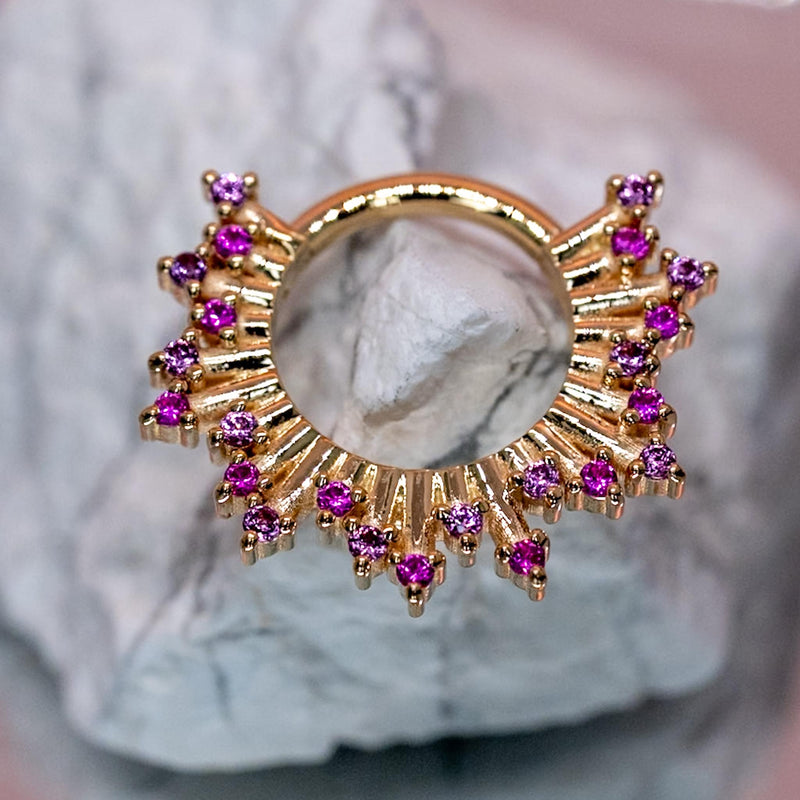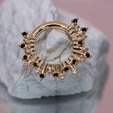 This stunning piece from BVLA features 1mm Gem in a prong setting on top of a Asymmetrical Rays. Measuring 4mm to the widest and gem count varies according to the diameter of the Hinge Ring from 23 to 25 1mm various gems setting.